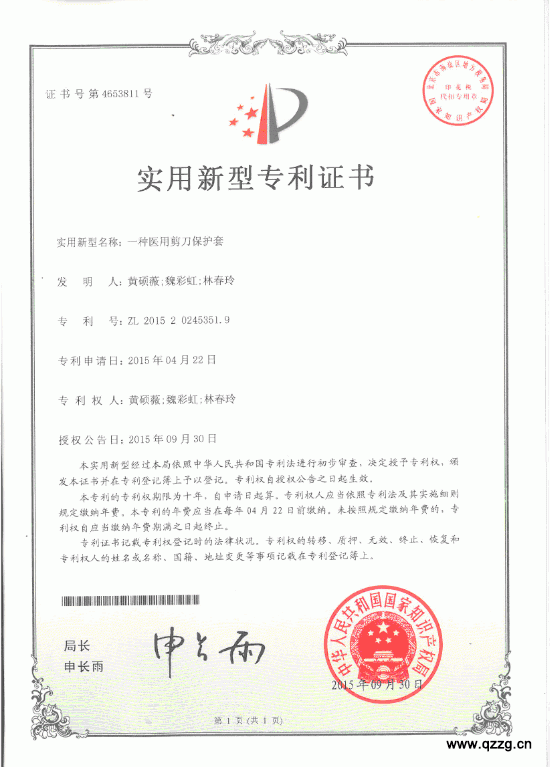 2015年,黄硕薇、魏彩虹、林春玲的“一种医用剪刀保护套”获实用新型专利证书
